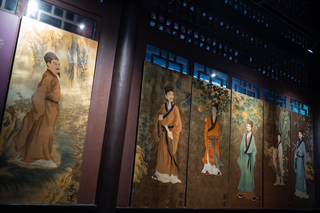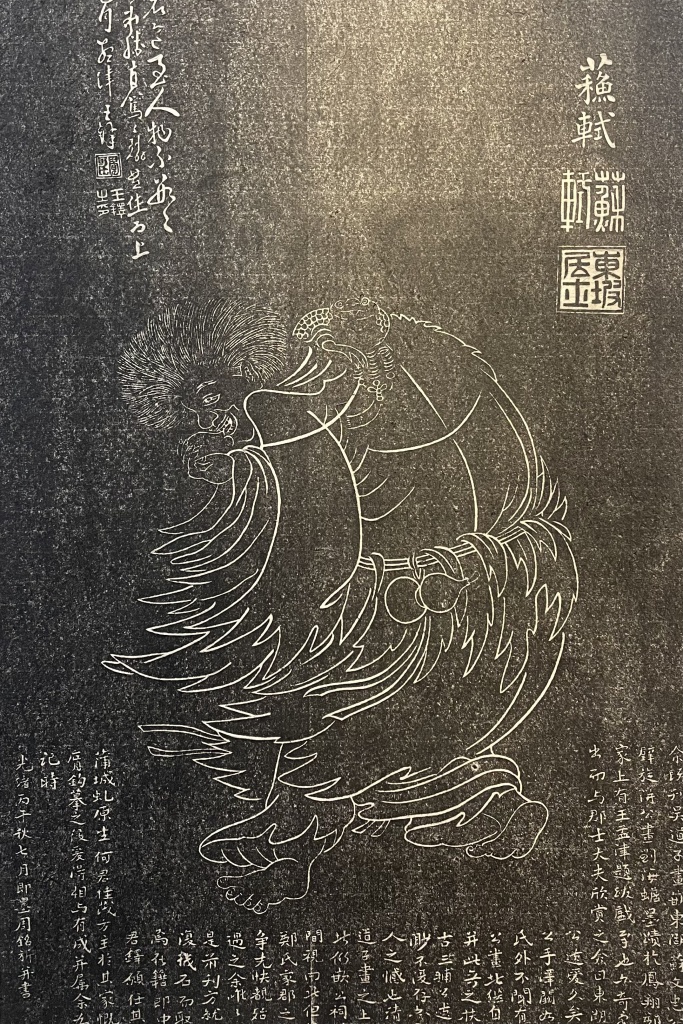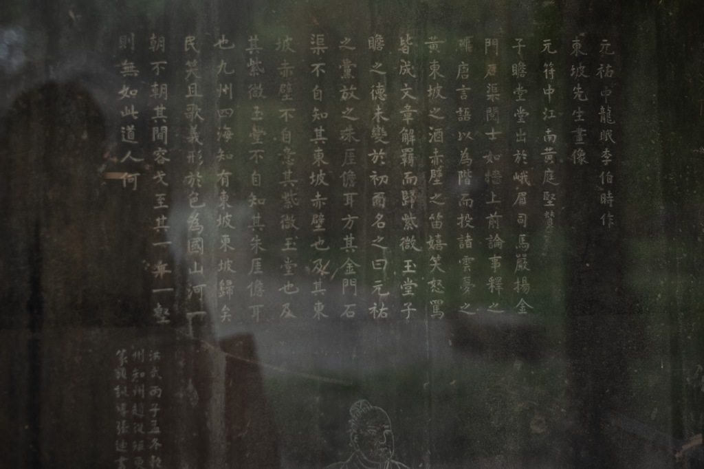 祠中碑廊有《明刻东坡盘陀画像》碑,为伯时(公麟)所画东坡像,附东轩(苏辙)诗、山谷(黄庭坚)赞,号“三绝”。伯时与东坡相熟,又极善画,故而此像当为东坡真貌。