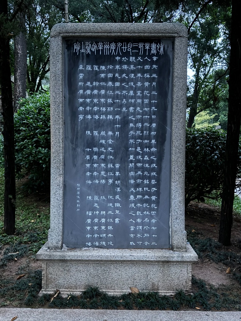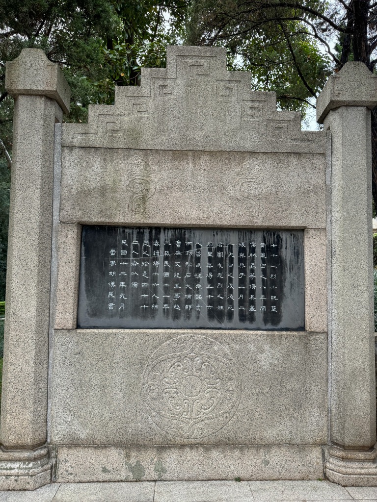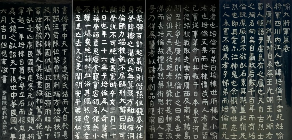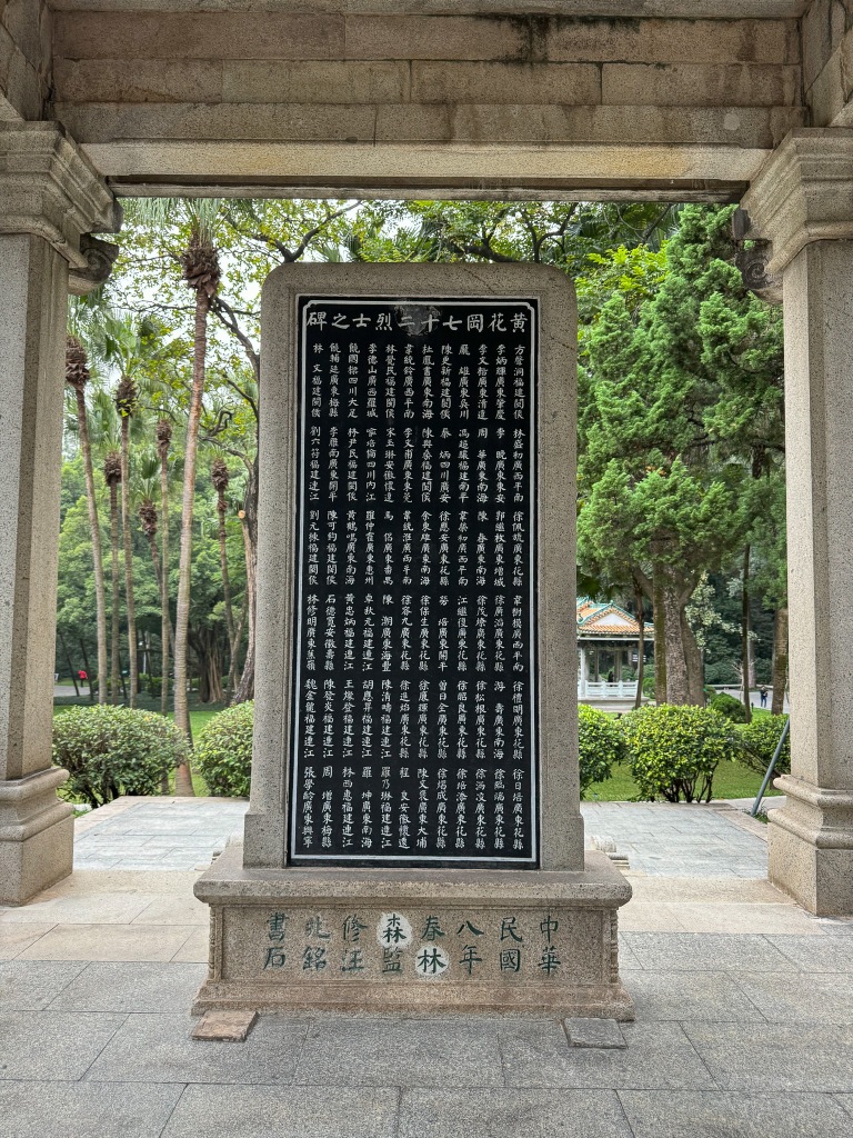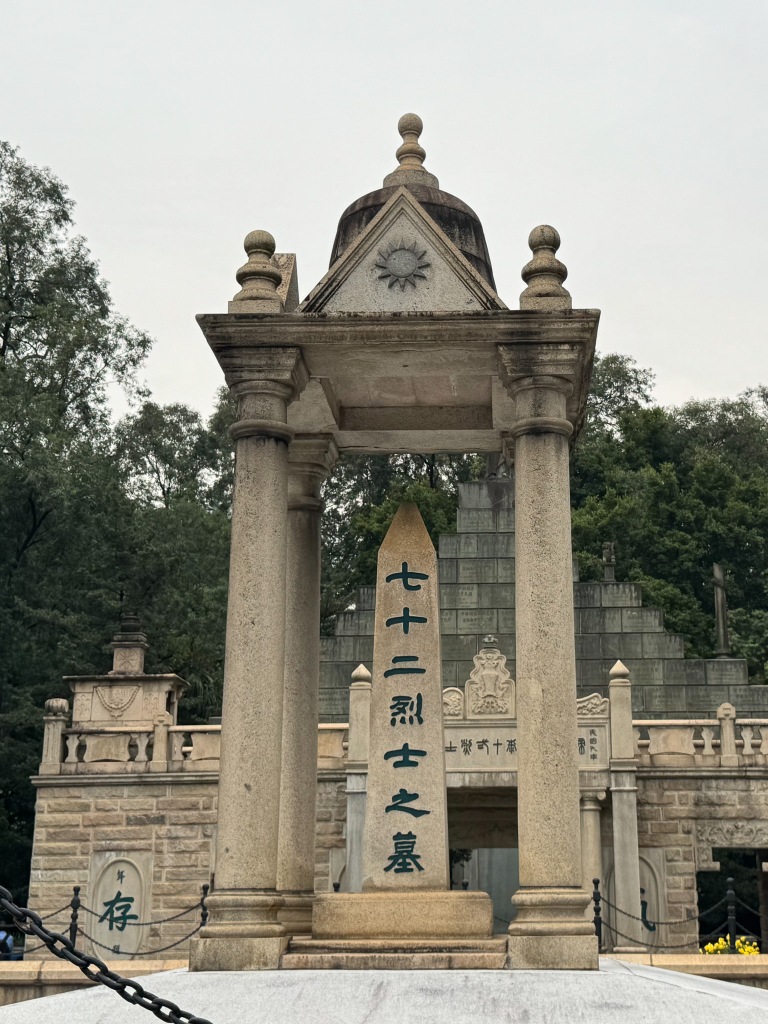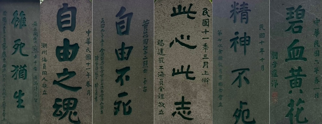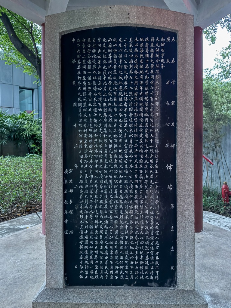 早年可登至纪念碑二层国民党各支部献石广州最大的纪念碑。其正面刻邹鲁所撰《广州辛亥甘九日革命记》,可惜碑太高,读不到原文。而网络竟无转录。而孙文为其所作序文流传深远,即是“是役也,碧血横飞,浩气四塞,草木为之含悲,风云因而变色。全国久蛰之人心,乃大兴奋。怨愤所积,如怒涛排壑,不可遏抑,不半载而武昌之革命以成”。碑阴所刻阵亡就义义士名录民国式样的中式亭子林森监修,汪精卫所书之七十二烈士名录黄花岗七十二烈士碑记【大埔邹鲁撰,番禺胡毅书】广州辛亥三月二十九日之役,党人死事者其数不可稽。事后潘君达微收党人尸得七十二,合葬之于黄花岗。由是有黄花岗七十二烈士之称。潘君亦党人,自以未名捕,乃于危疑震撼之际毅然出收死友之骨,可谓难矣。其明年为中华民国元年,胡君汉民、陈君炯明相继任广东都督。议就当日合葬处修葺而整饬之。省议会通过经费十万元。二年乱作,遂不果。七年秋滇军师长方君聲涛始募修故墓,规模粗具。参议院议长林君森复募建碑亭及纪功坊,俾不至淹没于后世。然欲举当日死事者姓名籍贯一一泐之于碑,事乃至难。盖举事之际务慎密,凡姓名籍贯同事者非素识不能知,且亦不愿知之。故今日同事之未死者其所能举亦惟素识者而已。夫死事者既不止七十二人,既此七十二人亦不能尽举其姓名籍贯,可不痛欤?鲁与朱君大符皆同事之未死者也。相与征集事实,胪所得死事者之姓名籍贯。林君森更约当日未死同事之在粤者胡君毅、何君克夫、吴君永珊、徐君维杨等以确为之证,记得五十有六人。其中有姓名而无籍贯者尚有三人,现行泐之于碑而留空白以俟续有所知,得以补泐。马颜曰:黄花岗七十二烈士之碑盖埋骨者,固七十二人。今日虽有所阙,固望他日能补而足之也。夫马革裹尸,党人之志。埋骨已非,所期遑论留名。今之为此,徒以为后人流连凭吊之资。于死事者固无与也。呜呼此役所丧失者不特吾党之精锐而已,盖合国中之俊良以为一炬。其物质与牺牲不可谓不大。然精神所激发,使天下皆了然于党人之志节操行与革命之不可以己故。不逾年而中华民国遂以告成。则其关系宁不重欤?然念国难之无穷贤才之易尽,执笔作记又不胜后死之感也。 – 中华民国八年十二月十八日七十二烈士既葬黄花岗之八年,闽侯林森等修其墓,复与与于三月二十九日之役后死者审求先烈之姓名、里乘,得五十六人。番禺汪兆铭书而勒诸石,大埔邹鲁为文纪其事。越三载,民国十一年春,续得十六人,补志之,于是七十二人者以备。民国十二年九月 番禺胡汉民书。补书辛亥三月二十九广州革命烈士碑以廖仲恺名义发表之保护黄花岗烈士陵园布告邓铿墓。邓铿曾参加黄黄冈起义,后任粤军第一师师长,是黄埔军校创办前革命军嫡系元老。可惜死于暗杀。邓铿之遇害宣传多影射陈炯明,却无证据公论。而其遇害于车站,却不禁使人联想到宋教仁。大丈夫死非其所,惜哉!民国航天先驱杨仙逸,死于视察水雷时殉爆喻大将军墓表其四面碑文如下:将军四川内江人也。讳培伦,字云纪,姓喻氏。广州就义时自承为王光明。王光明者,蜀人恒语子虚乌有之属也。夫自古烈士之殉名尚矣。自聂政后数千百年而有培伦。既糜厥身,不欲以名累其亲,盖非独死烈也。即其意尔,泣鬼神也。余观当世志士仁人,未尝不繇为孝子悌弟。而培伦其尤著者也。培伦有弟曰培棣,世所称大小喻者也。培伦文柔而培棣强武。两人者盖皆已尝从事革命而共学于日本东京。河口之役培棣战败走云南广西及南洋诸岛间。至于争赴广州,则培伦止之曰:我去汝必留,俱死无为,徒绝老亲欢。于世相抱流涕而去。培伦故擅暴烈药术,冠于国人。之粤乃为医者,以诸苛剧品自随。穷两日夜制弹百许。起义时则偕熊但饶、秦分往身登,陴掷之湛伪兵无算。战方酣,敌弹洞培伦颐,力竭被执不屈,临刑大呼曰:头可断,学说不可绝。遂遇害,时辛亥三月二十九日也。年二十六,无子。培伦为人奇慧,研精药学,辄覃思废食。寝尝密锻为银药。小不谨,一爆几绝。苏时血浴其躯,然虑谍者奄至,遂亡去。久之更阐明安平药弹,秘著书传党中,天下多尊喻氏法而尤自矜憙躬试。汪、黄、陈、但、黎、曹谋刺端方。培伦挟弹从,不成。乃转图伪摄政。匿鉅弹所经桥下,事泄发藏。欧美人莫能尽识,相惊为绝艺,卒以是亡虏。民国既建,褒元功追赠大将军。越一年,培棣自蜀如粤,立石。而杨庶堪为文鑱之以诏天下后世。中华民国八年六月吉日但懋辛敬书。参议院议长林森监修。史坚如像。君番禺人,生前清已卯年五月五日。以庚子秋起义于广州不克,九月十八日死之。越十有二载辛亥革命告成,同人追维先烈造像刻石,以垂不朽。中华民国二年七月。孙文等公建。 In Memory of Sz Kin Yu. A native of the Pun Yu District, born 16th July 1897. Executed at Canton 27th November 1900. This statue is erected by his fellow-countrymen in lasting memory of his patriotism and martyrdom in the cause of Republicanism in China. -Sun Wen & others. 6th February 1913各界所赠纪碑汇集刘大同《九哭黄花岗》