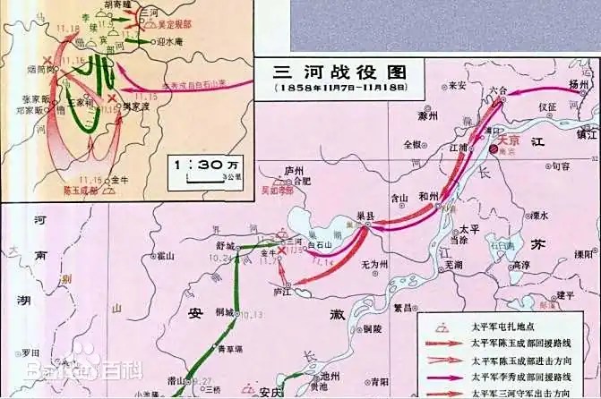 陳玉成攻破六合之後,忽有安省告急,黃梅、宿松、大湖、潛山、石牌、桐城、舒城一帶,被清朝將帥李續賓攻破,一日五文前來告急,故陳玉成無心下,當即扯兵上救。至京啟奏天王調我同往,伊先行扯兵上去,我隨後而往,直由巢縣而進。那時三河複守之時,是吳定規,被李續賓逼困甚嚴。成天豫陳玉成,那時已封前軍主將,領軍由巢縣到白石山金牛而進,包三河之後,斷李續賓後路,塞舒城不通三河李營之救。斯時李軍見陳玉成之軍,屯紥金牛,欲四更撲到主將營邊。依續賓要黎明開仗,李家部將要五更開仗,李云:「陳玉成兵壯,恐戰未成,各將豈不誤我之事?」是以五更未開戰也。若依其五更開戰,則陳玉成之兵必敗。黎明之時,陳將之寨,即被李將攻破。追陳將之兵,忽衝過於金牛去矣。天色未明,蒙露甚大,只聞人聲,不知響處,那知陳玉成尚在李續賓之後,李將追過陳將之前,陳將在李將之後殺出。那時李將始知陳將由後殺來,複軍回敵,李軍自亂,死去千餘。查白石山隔金牛廿五里,那時陳玉成奏調我往,天王封我為後軍主將隨後而來,是早在白石山十餘里屯紥。我聽聞金牛洞炮聲不絕,知是開戰,我親引本部人馬向三河邊近而來,正逢陳李兩將軍迎敵,離李將營前七八里交鋒。