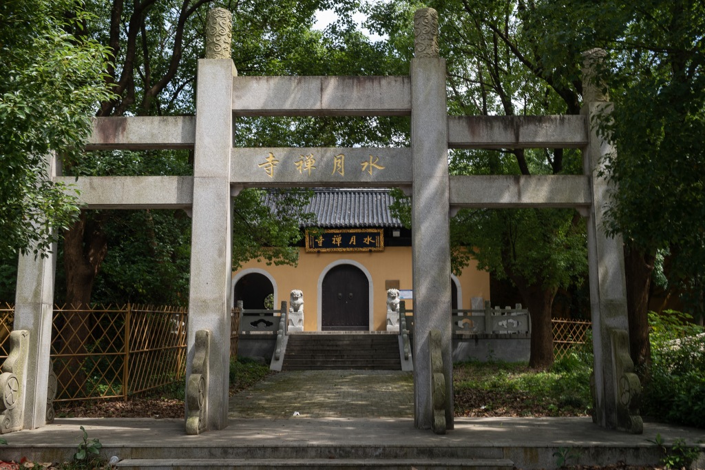 即岸,步自松间,出数里至峰下,有佛庙号水月者。阁殿甚古,像设严焕,旁有澄泉,洁清甘凉,极旱不枯,不类他水。梁大同四年始建佛寺,至隋大业六年遂废不存。唐光化中,有浮屠志勤者,历游四方,至此,爱而不能去,复于旧址结庐诵经,后因而屋之,至数十百楹。天祐四年,刺史曹琏以明月名其院。勤老且死,其徒嗣之,迄今七世不绝。国朝大中祥符初,有诏又易今名。