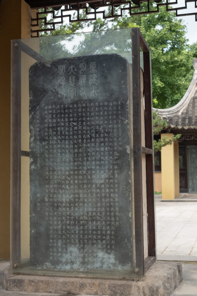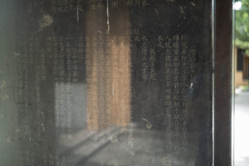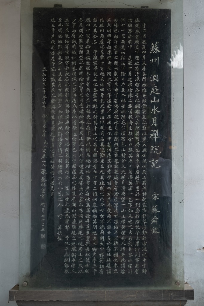 夜宿湖岛深处,远眺依稀可望湖州灯火。次日冒暑登太湖最高之缥缈峰,本已做好被炙烤的觉悟,熟料山顶上清风和畅,顿消旬月积热。下山途经碧螺春的发源地水月坞,以及得名更古的水月禅寺。无意于此间竟寻得苏舜钦的《苏州洞庭山水月禅院记》碑。早上随手翻读宋诗,恰读到苏子的《城南感怀呈永叔》诗而叹其兼有子美遗风(苏子亦字子美),不想下午竟便邂逅!而苏子文中所述登山所述,恰是我同感却不能言语表达之情,特录全文于左: