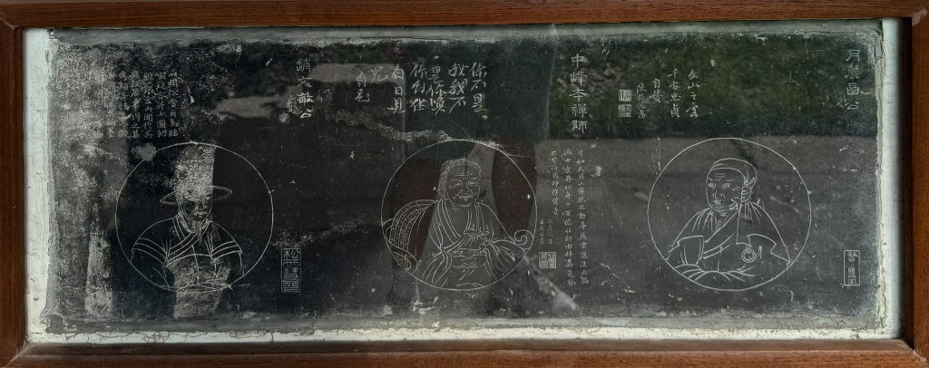 十一、《月麓昌公、中峰本禅师、赵文敏公画像石刻》 (按查,月麓昌公即赵孟僩,赵文敏族兄,曾为文天祥从事抗元,后隐居松江为僧。故其像上陈继儒提赞曰:“文山之客,千古忠贞”(文山,文天祥之号);中峰明本和尚,二赵尊师,为元顺帝封为国师,其像上录其偈语“你不是我,我不是你,唤作幻伥,白日见鬼”。为二赵奉为师);赵文敏画像上提”此赵松雪自为临写镜容,并玉图刻,贮一银盒内,闻于吴兴故居中得之。其秀颖奇特,足令观者解颐”)