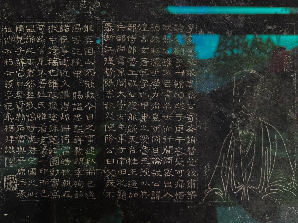 文庙中,同样罕见的石刻,还有张苍水狱中诗稿。可惜字小、涣漫,仅辨别其中一首:清秋萧瑟井梧寒,在莒齐襄泪未乾。七十二城犹在望,却无举火似田单。