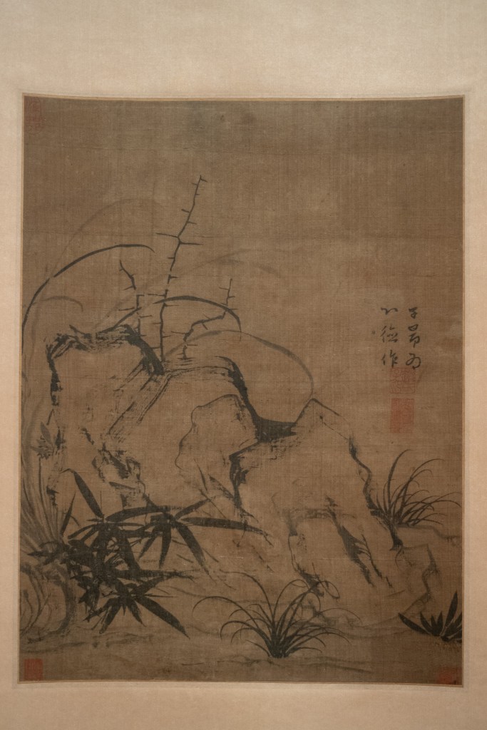 元代赵孟頫 《兰石图》,以“飞白”法作岩,以草书法作兰叶,以隶书撇法作竹叶