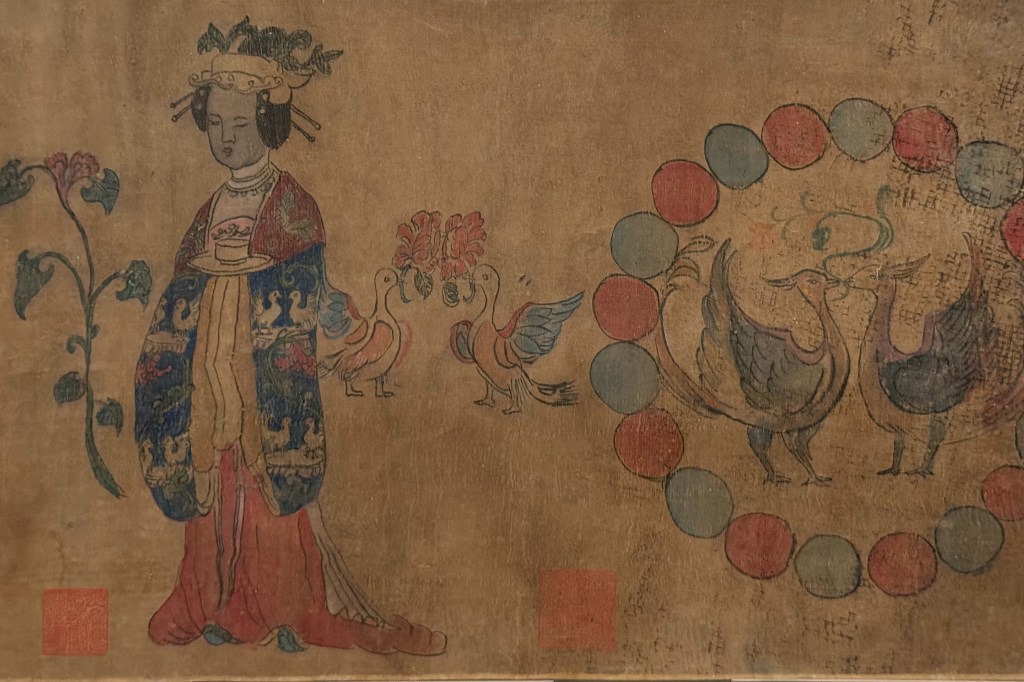 出土于甘肃,为随葬图画。图中花、鸟大约有飞天、长生之意。