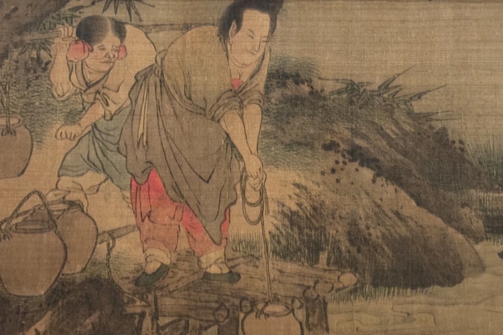 梁楷以简笔写意闻名,其工笔画亦堪翘楚。此为其中期之笔,由八个佛教故事组成。此画卷各作技法不竟相同。前者多位工笔,人物面部用晕染。而最后一幅以写意为主,其“钉头鼠尾”在其余卷中则不见。