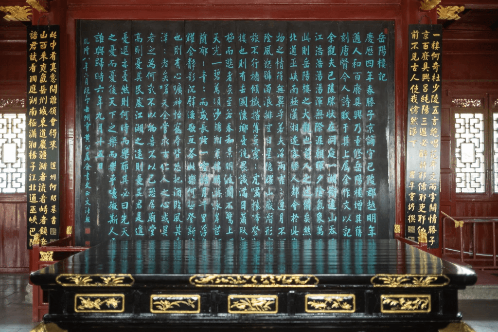 《岳阳楼记》以风景开篇,分别描绘岳阳楼所见洞庭湖阴雨连绵和风和日丽之景致。从文学角度欣赏,其辞如涌出,气势磅礴,可惜稍有些用力过猛 – “淫雨霏霏,连月不开。阴风怒号,浊浪排空。日星隐曜,山岳潜形。商旅不行,樯倾楫摧”,铺陈排比,未脱南朝遗风。何如东坡前后《赤壁赋》,尤其是后者“江流有声,断岸千尺,山高月小,水落石出”不着一字,尽显风流。